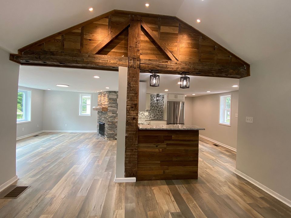 Well before I describe the home, I want to say I have always had this vision that the village of Plymouth would come back to life and be this really nice place to live. I have lived here my whole life and I love it! So, I approached my friend, Ryan, and said let's try to fix up some of the properties in town. He was all for it! He involved his family and has more knowledge than me. We went to work on this home, and it has been a loooong project! We basically gutted the whole house and made everything new except for the existing timber frame of the home. We used reclaimed materials from the Plymouth locomotive mixed with new touches like granite counter tops, all new appliances, new heating and cooling, and first floor laundry. We created a vaulted ceiling in the dining room, highlighting the timber frame of the house and hid a ceramic bird for good luck in the rafters :) Outside it has a nice front porch and rear deck that have been totally redone. The rear deck would be great for entertaining. I hope a nice family comes along and falls in love with it!