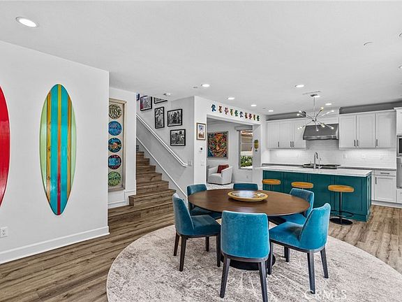 Step inside this meticulously crafted home and experience luxury in every detail. Built in 2018, this stunning 3-bedroom, 3-bathroom residence with loft spans 2,374 sqft on a 5,204 sqft lot.The main floor features a seamlessly integrated dining area with sliding glass doors that embrace indoor-outdoor living. The kitchen is a chef's delight, boasting a barn-style sink, Wolf stainless steel appliances, a reverse osmosis water filter system, quartz countertops with full height backsplash, soft-closed shaker cabinets with custom shelving, and a spacious pantry. Adjacent to the kitchen, the living room exudes elegance with decorative ceiling beams, a mounted flat screen TV against a castle brick white staggered accent wall matching the kitchen backsplash, and a sandstone finish fireplace. Luxury vinyl floors grace the entire first level and continue upstairs. The primary bedroom has natural light and features a white shiplap ceiling with recessed lighting, custom shades, and plantation shutters throughout the home. The en-suite primary bathroom offers dual vanity sinks, a soaking tub, walk-in shower, and a large walk-in closet. A versatile bonus loft area with custom framing and crown molding, perfect for an office space or entertainment center. An upstairs laundry room for added convenience, and a third bedroom with the third bathroom that completes the second floor. Additional highlights include a downstairs bedroom, bathroom with a standing shower, and custom closet on the main level, which is great for guests. The home also includes a two-car garage with custom built-in shelving. Located in the coveted Sea Summit Aqua Community, enjoy close proximity to San Clemente beaches, hiking trails, and the San Clemente Outlets. Don't miss the chance to call this meticulously designed residence your home!