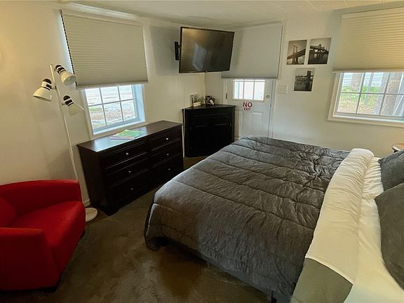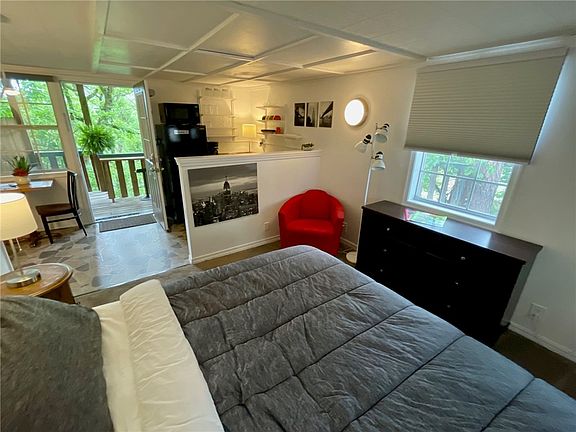 Enjoy the perfect Eureka getaway with two separate nightly rentals and a great location in the middle of town. The street level suite has a king bed, kitchenette with a refrigerator and microwave, and a bath with a tiled shower. The large covered back deck is a great place to relax and enjoy a cocktail. The lower level has an open living area with a queen bed, mid-century style sofa, refrigerator, microwave and a private bath with a shower. There is a covered porch and pea graveled patio with a picnic table for outdoor dining. An attached storage room on the lower level has a washer-dryer hookup. Furnishings are included. Across the street from Bubba's Barbecue and a short walk to the Community Center and Farmer's Market. Black Bass Lake Trails are a few minutes away to enjoy hiking and mountain biking. Larger Lake Leatherwood Park is three miles west on Highway 62. Take the trolley for shopping and dining in historic downtown. Two private off-street parking spaces in front.