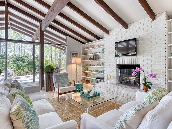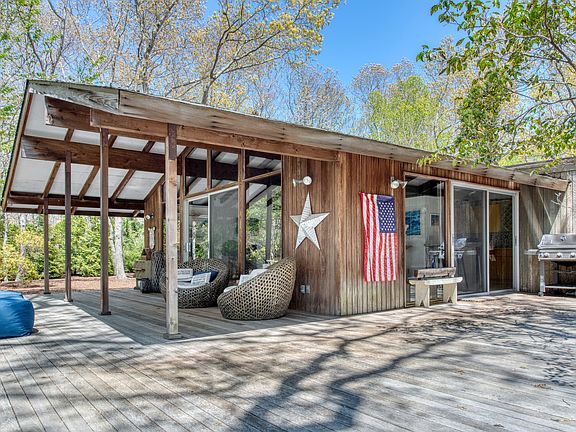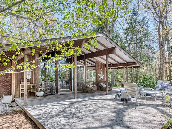 Perfectly located in Water Mill's horse country, this newly listed home features 3 bedrooms, 2 bathrooms, a large living area with vaulted ceiling and wood burning fireplace. Sited on two western-facing acres overlooking multi-million dollar homes, this property is perfect for the discerning buyer seeking a re-development opportunity or an architecturally-interesting home to renovate. Fun Fact: The home was featured in a 1966 Vacation Homes issue of "House Beautiful" as a sophisticated post-and-beam adaption by Techbuilt Inc. from a prototype design by Architect Carl Koch in 1954, and built by contractor Edward Pospisil. The home's exterior features include an expansive mahogany deck and raised walkway leading out to the heated Gunite pool, surrounded by a brick patio and specimen landscape plantings. The home's interior includes hardwood floors, central air, and mid-century artistic tilework in the kitchen. When you're ready for fun, you're only minutes away from Southampton Village and Bridgehampton restaurants, shopping, and world class beaches. 1.94 acres zoned CR-80, with 100% clearing allowance and 10% allowable lot coverage over 8,400 square feet provides for an extraordinary investment opportunity in a neighborhood of $3M-$6M homes.