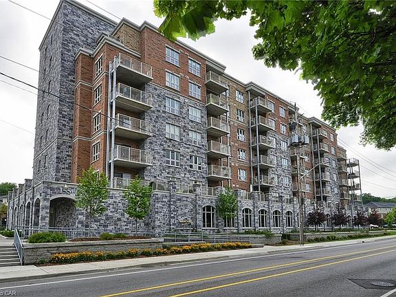 Welcome to the Riverfront Condominiums! This spectacular corner condo has amazing views of the Grand River. This is one of the largest units in this building of 1,320 square feet. Inside the open concept floor plan you will notice how bright it is in every room, because of the large windows. Sliding doors from the living room and master bedroom lead out to a huge balcony overlooking the amazing views of the Grand River. Some of the many features included are two spacious bedrooms, Master with walk-in -closet and 4-pc. ensuite bath and sitting area perfect for a that home office, two full sized bathrooms with granite counter tops, in-suite laundry, upgraded stainless steel appliances and ceramic and cork flooring also one owned indoor parking spot in the garage. Enjoy the building amenities which include a rooftop terrace with BBQ and panoramic views of downtown Galt. The historic downtown area offers lovely shops, restaurants and is perfect for outdoor enthusiast who loves the hiking trails, canoeing, fishing and more. This is a rare opportunity for anyone looking for a large unit in this building with incredible views. This size doesn't come up very often. Don't miss this opportunity! Book your showing today!