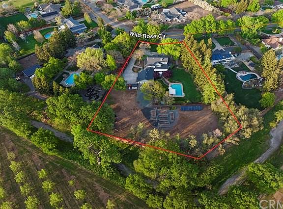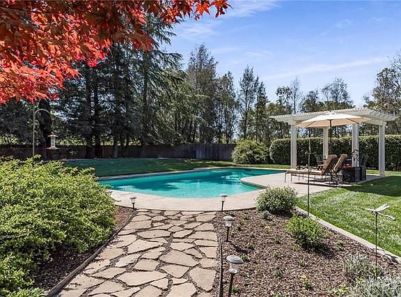 This stunning one-owner home abounds with pride of ownership. Featuring 1.57 acres, this North Chico country home checks every box--even for the most discerning buyer including owned solar, in ground pool, 3 car garage, manicured front and backyard landscaping, covered porches and patios, and so much more. As you enter the home, you will be greeted by a foyer that opens up to the beautifully updated living room with custom built ins, tall ceilings, and a Quadra-Fire pellet stove with thermostat. Even the pickiest of cooks will marvel at the beautifully remodeled kitchen which boasts tile backsplash, granite counters, paint grade custom cabinetry with pull out storage drawers, a 6 burner commercial grade gas stove, pot filler, convection/microwave oven, stainless steel appliances, dual sinks and ample countertop space with eat-in bar. The kitchen, formal dining room, and laundry room downstairs all boast waterproof vinyl plank flooring. This split floor-plan home is especially attractive as the master suite and separate office await on the first floor just off the living area while the remaining 3 bedrooms and 2 additional bathrooms await upstairs. Perfect for hosting and added privacy. You will also appreciate the half bath located just off the laundry room which offers easy access to the backyard where the beautiful pool awaits. Out back, you will marvel at the covered deck with private views of the established Japanese maples, redwood trees, lush grass and sparkling pool. The detached 3 car garage (1,000 sq ft) features a water softener, along with an additional separate storage room and separate wood working room. Beyond the fenced pool portion of the backyard awaits the raised garden beds on drip irrigation, mini orchard, and detached storage shed. This home is an absolute delight and has been utterly loved and beautifully maintained for a move-in ready investment. Don't forget to ask your realtor for the list of improvements this property has on file! You will be delighted by the pride of ownership!