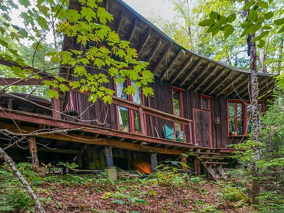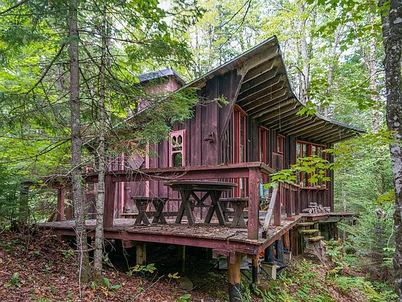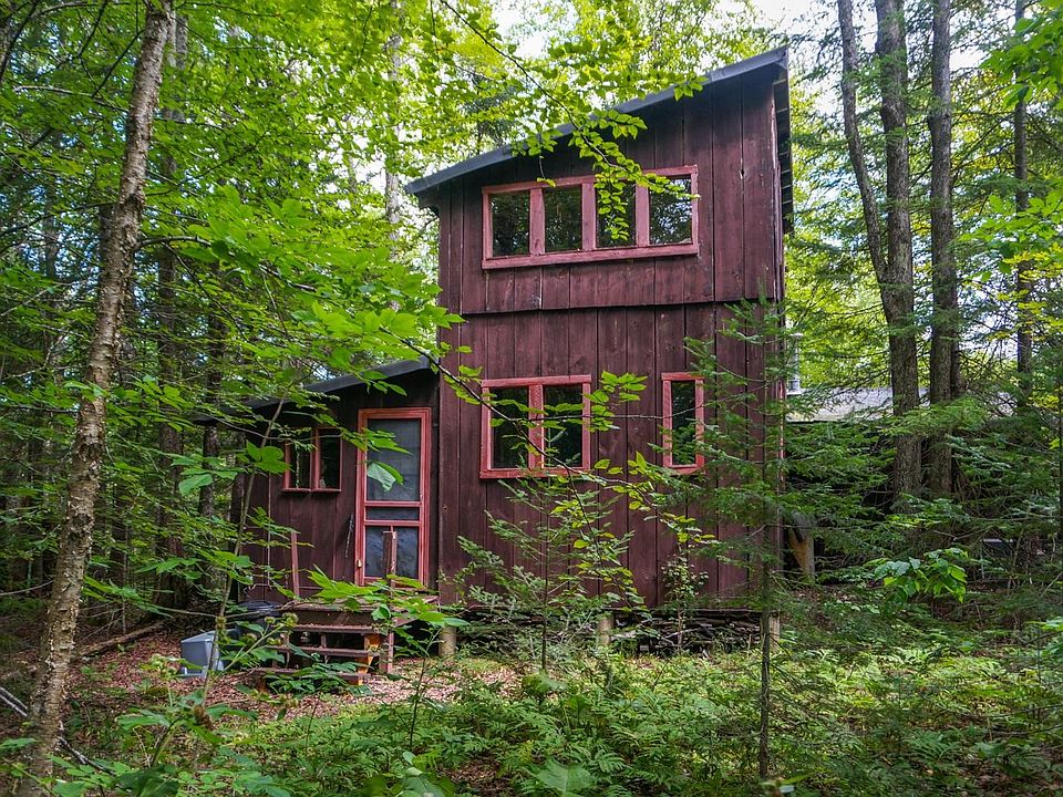 Nestled within the embrace of a tranquil forest, this 1970s off-grid cabin is a hidden gem amidst the trees, exuding a sense of simplicity and authentic charm that captivates the soul. The cabin's weathered wood exterior harmonizes effortlessly with its surroundings. Over the years, the elements have taken a toll on the wrap-around deck, but once replaced it will provide an inviting spot overlooking beautiful Flower Brook. Step inside to the rustic charm of natural wood throughout. The living and dining areas each have wood stoves to fight off the chill of autumn mornings. Handcrafted shelves, vintage kerosene lamps, and cozy nooks add charm and usable space. Small and functional, the kitchen features a vintage icebox, compact gas stove, and stainless-steel double-bowl sink. There is a full bath which will need some completion but the components are there. In the studio, inspiration is just beyond the windowpane as you sit at the built-in desk, with a loft bed overhead for a quick nap. A steep staircase leads to the main bedroom, a cozy perch among the trees. Venturing outside, the wooded surroundings offer privacy and the option of plenty of firewood. The location puts you within a mile of Kingdom Trails and a short drive to Burke Mountain. Power is at the street, and a makeshift water system could be made functional again. This cabin is a haven for those who aspire as poets and artists or anyone seeking tranquil respite from the outside world.