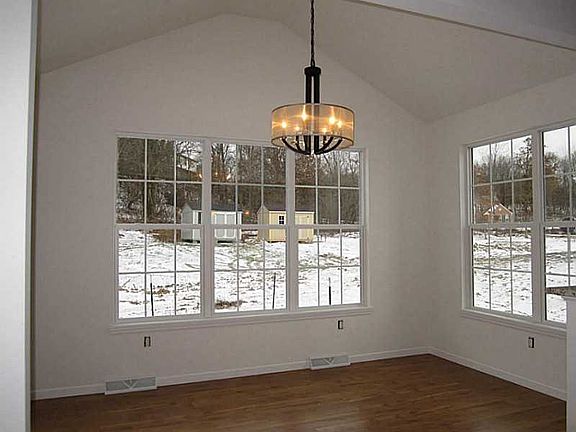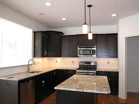 Meadow Ridge sidewalk community- Custom Built by Pitell.Over 1/2acre lot w/mature trees.Partial stone face cov entry,9'ceil 1st flr,woodlike laminate flr in Ent,Powder,LR,Kit.&MornRm.Center isl kitchen w/custom cabinets,stainless appliances.Vaulted morning room.Ceramic &dbl basins in both Bths up.2nd flr laundry w/ceramic.Brushed nickel fixtures&lighting.Carriage style grg doors w/openers.Walk out lower level has rough in for bath.Energy rated home w/high efficiency furnace.Lights in all BR.Quality Blt