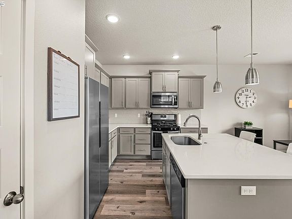 Cool contemporary design in the scenic Gales Creek Terrace neighborhood. With 5 bedrooms & 3.5 bathrooms, this home lives large. High ceilings, wonderful windows and inviting rooms, easy care Vinyl Plank flooring, entry hallway and high ceilings lead to the this popular great room designed living room space. Large Island kitchen with plenty of counter space and cabinets as well as a handy storage pantry. All kitchen appliances are included. Living area has a corner gas fireplace. Sliding door to the deck from the dining area. Enjoy the peaceful views of the Coast Range from the Vaulted Owner's Suite. Walk-in closet, bathroom with walk-in shower & double sink vanity. Wonderful private space in the finished basement has a Bedroom, full bath, and living room with a slider to the backyard. Plenty of extra storage in the basement. Scenic community walking paths, parks, and an easy walk to town, bus line and Pacific University; just in time for downtown Forest Grove Farmer's Market! Forced air heating and AC. Neighborhood HOA is only $38 per month for maintaining common areas and management.