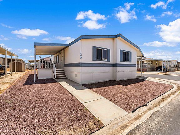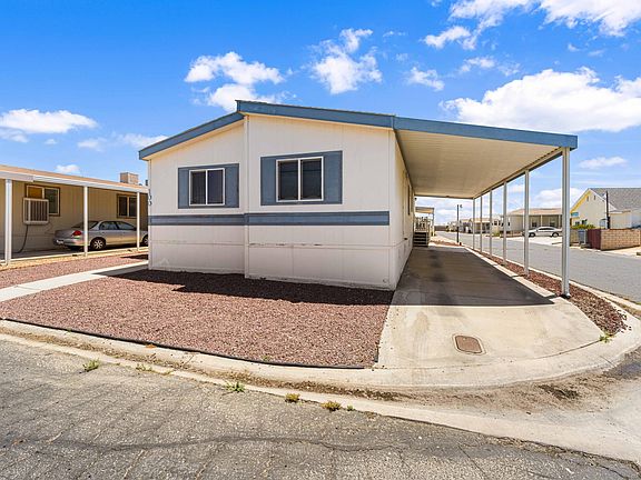 You must see this cozy double wide mobile home located in Tara Estates in Rosamond! Located on a corner lot with a covered porch and a tandem two-car carport, this home has everything you need! Walk through the front door to an open layout living room and dining room area. The living room features a skylight window to bring in plenty of sunlight and the fireplace ties it all in for a comfortable night in. The kitchen has plenty of storage and tile countertops. Access to the laundry room is through the kitchen with another exterior door to the car port. The primary bedroom is adjacent to the living room and has a large primary bathroom with a bathtub. The other two bedrooms and full bathroom are on the other side of the living room. The front porch has plenty of space for a BBQ and outdoor seating. There is also a shed in the back of the property for extra storage! This mobile home will meet all of your needs and more, come see it today before its gone!