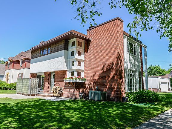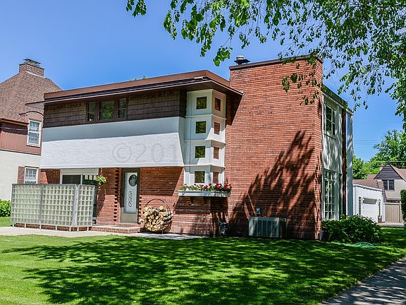 Rare Frank Lloyd Wright inspired home located on the highly sought after South 8th Street in Fargo! Get ready to fall in love with this architectural beauty and all that it has to offer including refinished hardwood floors, updated kitchen with quartz counters + eat-in area, formal dining room with heated tile floor + front patio access, a spacious living room with wood burning fireplace, beautiful curved staircase, and gorgeous big windows that let in so much natural light! Upstairs, enjoy 3 bedrooms- all with hardwood floors, master bedroom with walk-in closet, a stunning updated Hollywood bath with tile throughout + soaking tub, and a fantastic rooftop patio! There's plenty of room in the over sized, finished, heated 2.5 stall garage and extra parking spaces if needed!