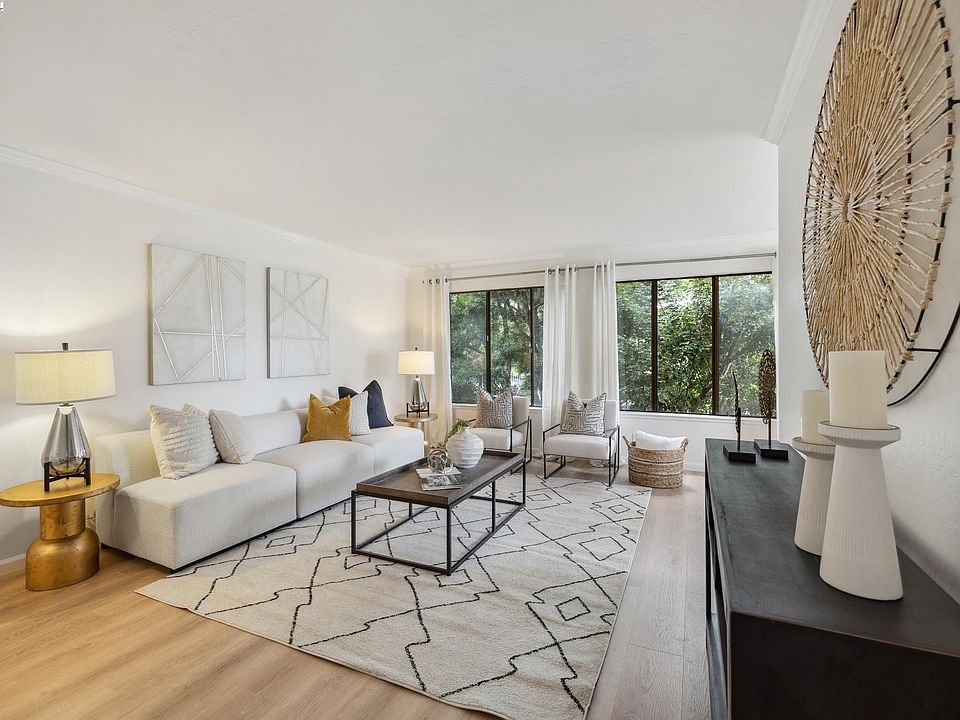 Embrace the allure of top-floor living in Unit 231 at Nugent Square, a beacon of mid-century modern design in the coveted Assumption Parish neighborhood. This luminous two-bedroom, two-bath condo spans 1,480 square feet, boasting an open-plan sanctuary graced with large windows and a skylight that bathe the space in natural light, showcasing the elegant luxury vinyl plank floors. Enjoy the fusion of style and functionality in your gourmet kitchen, offering newer appliances amid a canvas awaiting your personal touch. The spacious living room, centered around a charming gas fireplace, is perfect for homely comfort or exquisite entertaining. Retreat to the expansive balcony for tranquil moments outdoors, framed by the serene tree-lined vistas of the neighborhood. The residence is complemented by a generous in-unit laundry room with additional storage, ensuring practical living without compromising on style. Nugent Square presents an array of refined amenities including secure underground parking, elevator service, and vigilant security measures, all adding to the essence of exclusive condo living. Situated just moments from connectivity hubs, shopping, and leisure, Unit 231 is more than a home—it's a statement of sophistication and convenience in San Leandro.