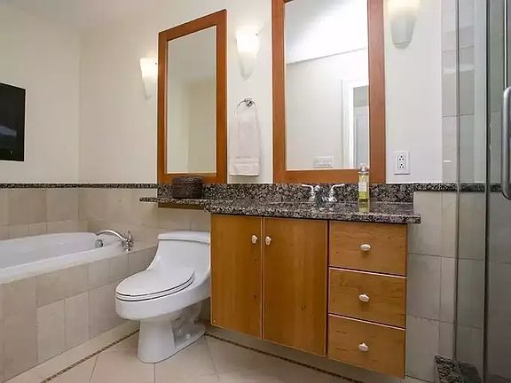 Gorgeous and spacious kitchen with Granite countertops, Miele stainless appliances and Cherrywood Cabinetry. Master Bedroom with walk in closet and en suite with air jet tub, glass enclosed shower, and granite countertops. Second Bedroom presently being used as Den with 3 piece bath with glass shower just off bedroom