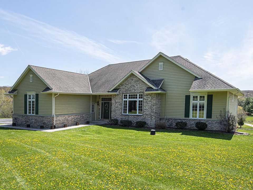 Looking for a Grand executive home? Here you have it. This 3 bedroom, 3.5 bath open concept walk-out ranch lends itself to entertaining. Large cooks; kitchen with bar/island, custom cabinets, pot sink, SS appliances, open to dinette and living room w/vaulted ceilings, GFP, outstanding views. Main level master suite w/WIC, 10' coffered ceiling, patio door to deck, views. Master bath has SS, soaking tub, DSV. 2nd bedroom features WIC. ML laundry w/skylight loads of cabinets. Den/office/3rd BR has French doors & BIBC. LL consists of office/den, family room w/hot tub, GFP, patio doors, guest suite w/ 15x6 WIC and dual entry bath, 49x25 workshop. 4 car attached garage + 2 heated outbuildings #1 24x33 heated/48x29 cold storage. # 2 40x30 heated, Pond w/pier All this on 10+/- acres.