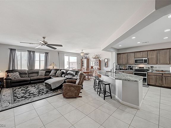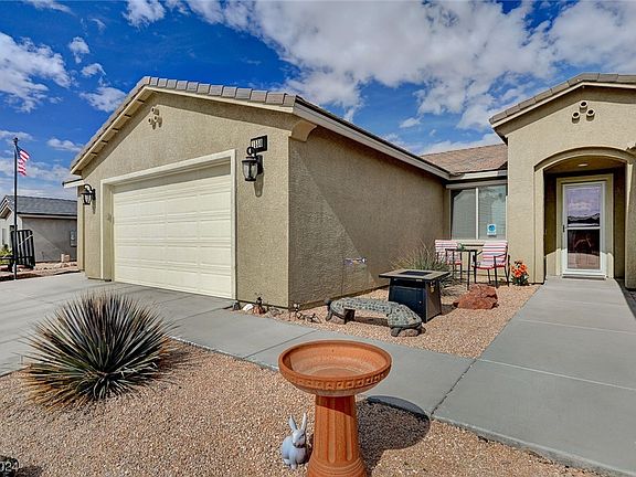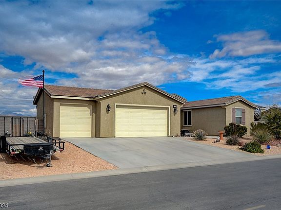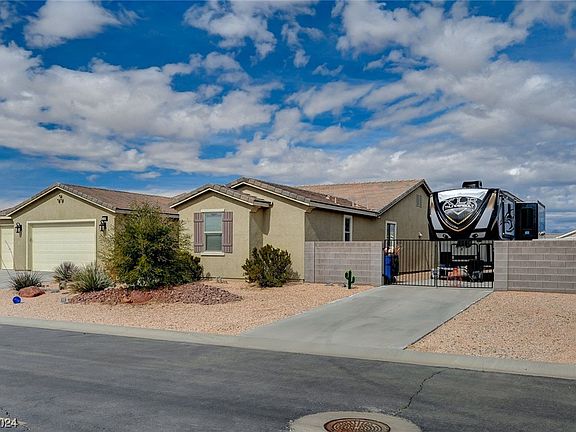 Home is in the newest subdivision in Logandale, NV! 5 bedrooms 3 baths with a spacious and open floor plan. Two bedrooms share a den and bathroom. Kitchen has breakfast bar/island and pantry. RV pad with gate with low maintenance yard! Primary bedroom has ceiling fan, blinds, sitting room and walk in closet. Primary bath has double sinks, tub and separate shower.