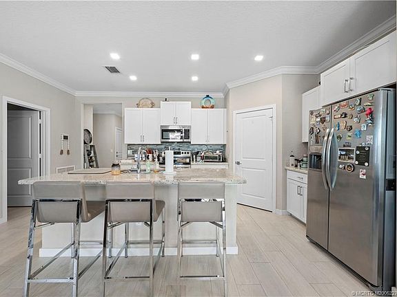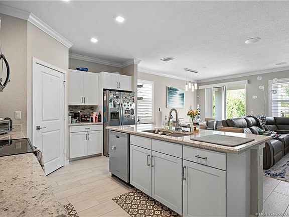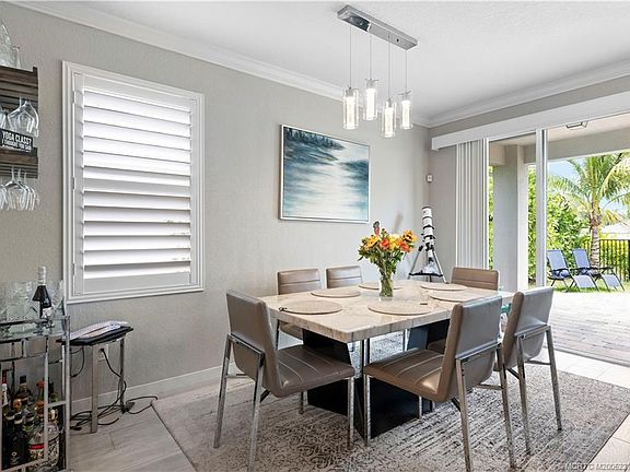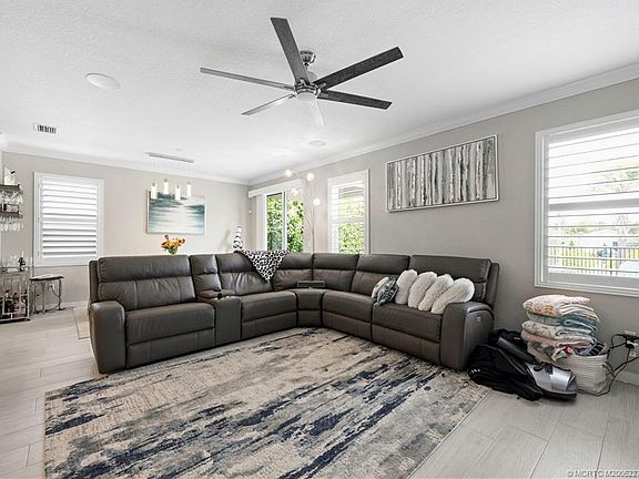 Location, Lifestyle & Luxury Upgrades! OWN your tropical retreat - 3 miles from the beach! ?? This 4BR home is filled with thoughtful upgrades inside and out. White porcelain tile flows throughout entire interior, paired with crown molding and custom closets for a polished finish. Modern touches include Wi-Fi–enabled fans, upgraded lighting, and wired sound - speakers in both the living room and patio. The open layout is ideal for gatherings, while the extended paver patio, beach sand, and five mature coconut palms create a true coastal escape. A sleek black aluminum fence defines the backyard, and the AC unit was relocated to maximize usable outdoor space. Live in Seawalk, a gated community, close to the sparkling pool, guest parking, and low-maintenance living. Enjoy dining, shopping, and A-rated schools. The charm of downtown Jensen within walking distance. This home delivers the perfect blend of comfort, convenience, and ease. Start living the best of Florida’s coastal lifestyle!
