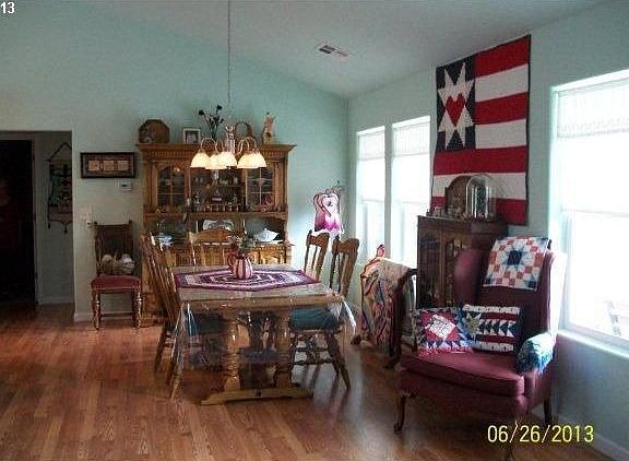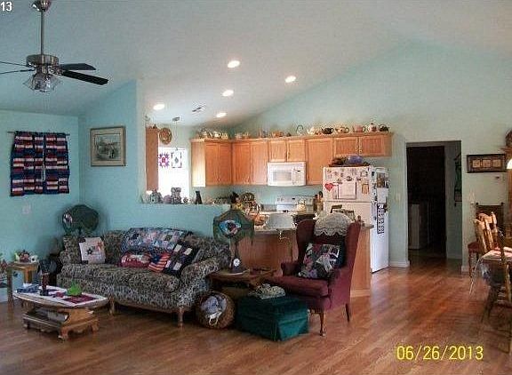 Almost new quality built home. Open floor plan with a spacious great room including the dining area, living area & kitchen. Floors are laminate throughout, living area has vaulted ceilings, custom kitchen with lots of cabinets & counter top area. Large master, walk-in closet & jetted tub. Fenced yard, garden beds, fruit trees. Covered porch & open rear deck.