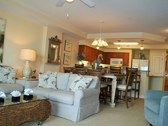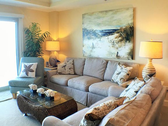 Professionally decorated 3BR/3BA sound front condo offering spectacular waterviews. Great floorplan with plenty of space (over1600 sqft) to enjoy with friends & family. Complex amenities outdoor swimming pool and waterslide, fitness room, soundfront pier, boat ramp, elevators & covered parking. Home finishes include granite countertops, high ceilings, crown molding, tray ceilings & all the comforts of home at the beach. The best of waterfront living with virtually no maintenance. Home warranty.