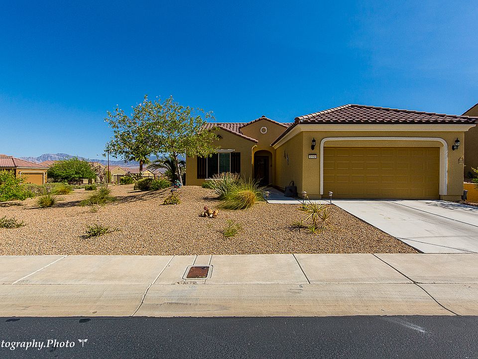 The SID is fully paid on this beautiful home that sits on a premium, large (over 8000 SF) elevated lot with pretty southern mountain views out back and eastern mountain views from the side yard. This 2 BR, 2 BA, plus den, 1571 SF home is located in the Sun City Overland Trail neighborhood.The open floorpan is made for entertaining. The kitchen, with granite, stainless appliances, and upgraded cabinets opens up to the large dining/living area. You will love the easy care extended tiles that are set on the diagonal. Very classy. Laundry room has a no-hassle, built-in ironing board. The exterior of this home was recently painted and looks beautiful. Enjoy the lovely mountain views from your large covered patio. The rear yard is fully fenced so your pets can enjoy the views, too!! Come live the care free active adult lifestyle in this premier Del Webb community where you will enjoy the small-town charm of Mesquite, Nevada and its proximity to Las Vegas and National Parks. Professional photos will be added after Tuesday, June 26.