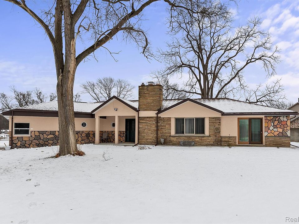 Welcome to this stunning ranch situated on a spacious corner lot with beautiful stone exterior and plenty of land to enjoy. Step inside to an open concept layout filled with natural light, featuring recessed lighting and a cozy fireplace in the living room that seamlessly flows into the family room and dining area, perfect for both everyday living and entertaining. The gorgeous kitchen offers oak cabinetry, elegant marble flooring, ample counter space, and all appliances included. Each bedroom is comfortably sized, providing a relaxing retreat. The bathrooms are beautifully updated with white marble finishes throughout, adding a touch of luxury. The fully finished basement expands your living space with a large recreation room and convenient laundry area. Updates in 2024 - roof, air condition, furnace, windows, water heater, appliances, kitchen, baths, electrical work, light fixtures, flooring, most drywall was replaced, plumbing and more. With its charming curb appeal, generous lot size, and move in ready interior, this home is a must see. All measurements are estimated and must be verified by the buyer and BA.