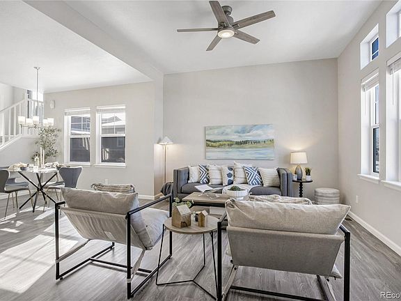 This home lives and feels like a single family home. With lower interest rates, this is a great opportunity to purchase this end unit home with an attached two car garage and finished basement. This townhome is one of the largest within the Residences at Buffalo Run and is simply pristine. It features a main level primary bedroom suite, with mountain views and an attached 3/4 bathroom with dual sinks, tile floors, a glass enclosed shower with bench seating and a subway tiled backsplash. The spacious great room and adjacent dining area both open up to the beautiful kitchen boasting an expansive island, with seating for four along with contemporary pendant lighting. The kitchen features stainless steel appliances, onyx countertops and a white subway tile backsplash that highlight the richly stained cabinets with nickel hardware. There is an additional full bathroom with tiled floors and tub surround, plus a spacious secondary bedroom towards the rear of the home, for added privacy. The laundry room is conveniently located on the main level and includes a separate mud room, located immediately off the door to your attached 2 car garage. The upper level features a spacious loft area, a third bedroom with ceiling fan and easy access to its private full bathroom. The basement was finished by the builder and features a huge family room, your fourth bedroom, with egress and another 3/4 bath. There are also two separate unfinished areas with plenty of space for all your extra storage needs. This beautiful home features recessed lighting, plenty of natural light, ceiling fans in all the bedrooms and LVP flooring that seamlessly runs throughout the main level, excluding the bedrooms and baths. There is also an economical tankless water heater, so you'll never run out of hot water! This fabulous home is situated close to Buffalo Run Golf Course, DIA along with plenty of shops and restaurants. This townhome is move-in ready and available for immediate occupancy. See it today!