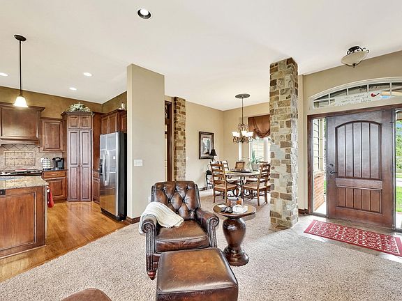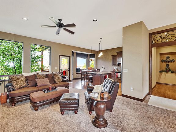Former Ritchie Model home in Monarch Landing. These 5 bedrooms and 3 bath home has an open floor plan and lots of windows and natural lighting. Kitchen features Knotty Alder cabinets and granite countertops, an island and walk-in pantry. Formal living room with gas fireplace and stone-faced mantel and formal dining room. Split ranch plan with Master bedroom and Master bath, 2 sinks a shower, tub and walk-in closet. The basement is a walk-out and view out basement. The basement was just recently repainted and new Luxury Vinyl installed. Great lighting, a Wet Bar and second gas fireplace and nice storage. There is a 3-car garage that is sheet rocked, a well and sprinkler system. Covered deck and a great view behind the home. Low specials and in the popular Andover School System.