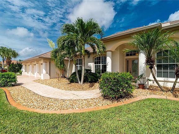 Resort style living at its best, this luxurious home is located on a double waterfront lot with 206 feet of water frontage and Gulf of Mexico boating access! The tropical landscaping, stamped concrete driveway and sidewalk, columns, and arched covered entrance lead to this magnificent home and stunning water backdrop. Walk past your elegant lead paned glass front door with matching sidelights to your million-dollar water view just beyond the Living Room sliding glass doors, heated pool, spa & screened lanai. The quality shows with every detail - high & vaulted ceilings, separate office, decorator lighting, art shelving, and so much more. The spacious gourmet kitchen is a chef's dream with brand new high-end stainless appliances, a built-in double oven, wood cabinets, a decorative tile backsplash, and a wrap-around breakfast bar; the perfect place to convene for morning coffee. The split floorplan gives you privacy from guests who will never want to leave, and you will wake to amazing water views in your Master Bedroom. Have breakfast in the nook overlooking the pool & lanai while you plan your day. Relax by the pool, fish off your cement dock, or launch your boat from your boat lift for a day on the water. Your Air Conditioned 3 car garage and shed with electric provide plenty of room to store your toys, and the hurricane shutters, security system, whole house RO System, and 2017 HVAC System are the icing on this decadent cake. Make this dream your reality and you will be the envy of everyone you know!