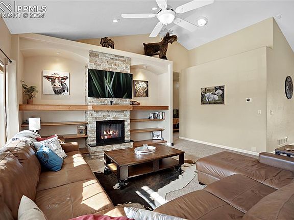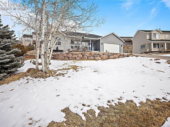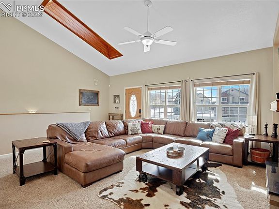 Beautiful rancher with great Pikes Peak views. As you walk in you are greeted with vaulted ceiling and natural light from the skylights, an electric fireplace and built-in shelves. The spacious kitchen features granite countertops, a sink with a view to the backyard and an attached dining room. From the dining you can walk out to the large patio area and enjoy the backyard, which also has a dog run! The primary bedroom offers an attached 5-piece bathroom and a large walk in closet. In the basement you will find two additional bedrooms, a room for an office, and an additional kitchen with appliances! The garage on this home is also spacious, a crew cab long bed truck fits (with an inch to spare). Come take a tour of this wonderful home and make it your own!