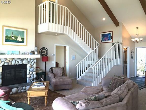 Ocean front living in Brookings. Enter into a custom built home framed by 18 Ft vaulted beamed living area, expansive windows that stretch from the floor to the ceiling, a 2 sided romantic fireplace that is seen from the living room and the master bedroom. Trex decking transitions the outside visitor from the light and bright home right to the ocean front breezes and a trail down to the beach. Wood cabinets and flooring in the kitchen.