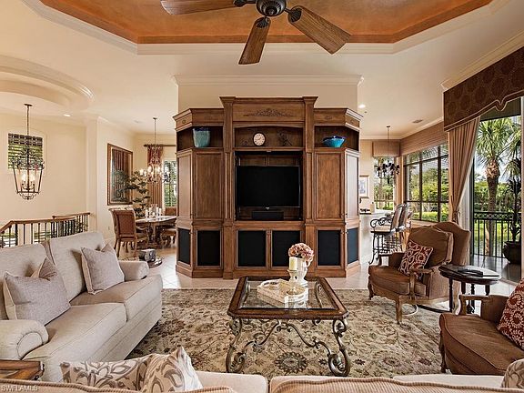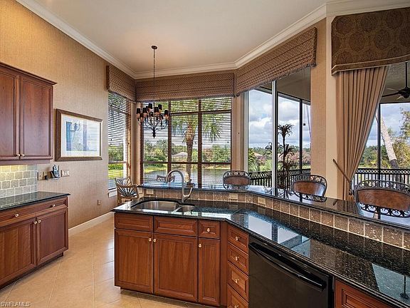 Enter this fantastic lakeside coach home by way of the stunning spiral staircase flowing into a lovely open floor plan. This home features volume tray ceilings, crown moldings, arched passageways and plantation shutters with beautiful tile laid on the diagonal throughout the main living areas. Recent updates to this home include new A/C, hot water tank and dishwasher. The spacious great room has amazing views through oversized sliders and features a custom built wood media center as a centerpiece of the room. Stunning upgrades adorn the spacious kitchen, to include rich wood cabinetry, granite countertops and breakfast bar, built in appliances and breakfast nook. Special occasion meals are served in the formal dining room with the adjacent service bar featuring display cabinetry, granite counter tops and wine cooler. The intimate den is complete with rich wood built ins including a functional desk workspace. The master bedroom retreat features direct access to the screened lanai, his and hers walk in closets, and master bathroom with his and hers vanities, a jetted tub & walk in shower. Enjoy tropical paradise from the screened lanai that offers amazing sparkling serene lake views!