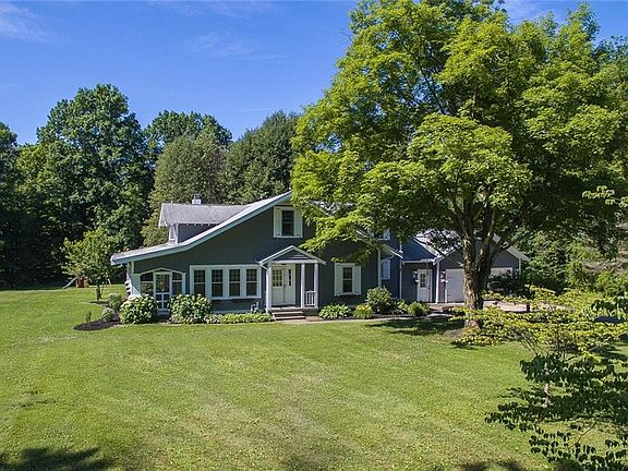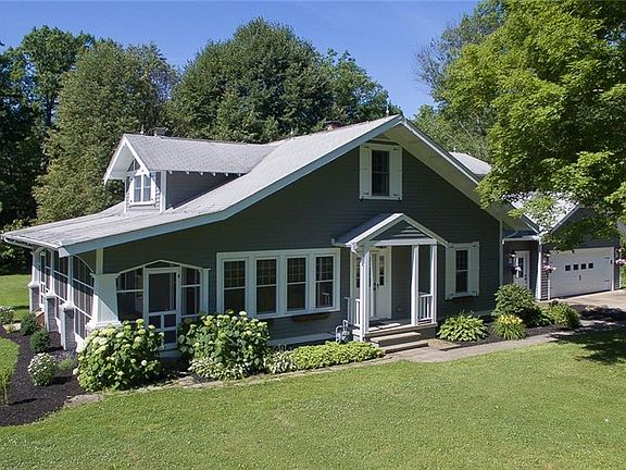 Imagine living on four and a half beautiful acres and having the rare opportunity to experience nature at its best with serene wooded views, orchard producing fruit trees and more... all just 5 minutes away from the Village of Chagrin Falls! This 1922 charming craftsman style home has been meticulously cared for and updated for all the modern amenities desired. Enjoy cooking in the chef's kitchen which has been completely renovated and showcases beautiful exposed brick, quartz counters, custom white cabinetry, stainless steel appliances and ceramic tile. Easy to entertain guests as the kitchen opens to the brightly lit family room with its ample windows, featuring the painted brick gas burning fireplace with its rich barn beam mantle. The open floor plan continues through the dining area and adjoins the incredible large living room with yet another brick gas burning fireplace and lovely built in wall cabinets with glass doors. The first floor ensuite's bath includes granite counter, subway tile and glass enclosure for the tub/shower. There is a sweet sunroom that can also function as a first floor office. And the most special place to capture the ambiance of this breathtaking property is on the amazing screen porch! Many other upgrades and features including 1st floor laundry, newer windows on main level, newer hardwood flooring on the 2nd level, new Kinetico water system, generator, updated electrical in the outbuilding & much more! Call for a private showing today!