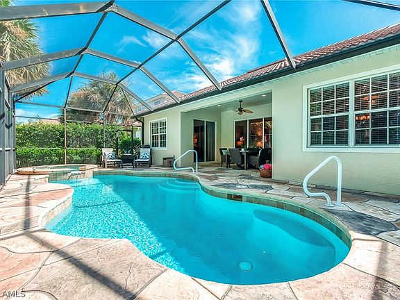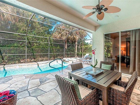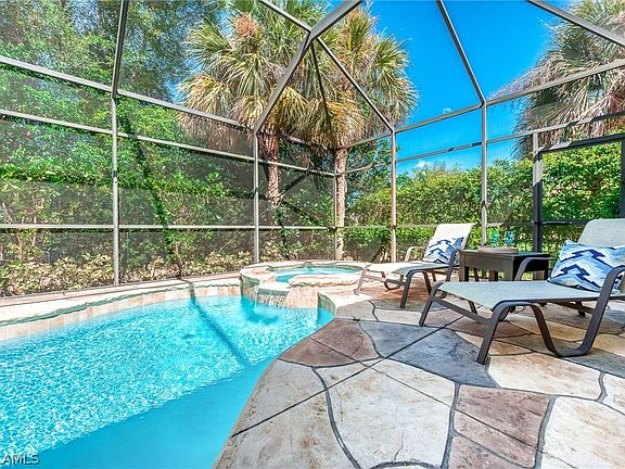 Back on the market - buyers got cold feet! Now is the chance to own the POOL home you've been looking for. Quick Close - Move right in this turnkey home in the highly desirable North Naples Delasol gated community! Nicely upgraded with crown molding and soaring ceilings with tray detailing. The split bedroom, open floor plan is perfect for entertaining with sliding doors that open onto a covered lanai with beautiful free form pool & spa with waterfall. Kitchen features 42” cabinets, granite, stainless appliances, pantry and eating area. Primary bedroom is an oasis with large walk in closet, spacious updated bathroom. Two additional bedrooms, full bath, large laundry room and 2 car garage provide all the space you need! Enjoy the best of South Florida living with recently updated resort-style amenities; 1 block walk to clubhouse, fitness center, tennis/pickleball courts, pool & spa, basketball and children's play area. Enjoy the many social events throughout the year. Low HOA fees even include your Xfinity Internet and Cable! West of 75 with close proximity to Seed to Table, Mercato, beaches, the Airport & everything Naples has to offer plus A rated schools. Welcome home!