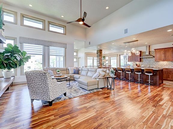 Step into modern luxury with this former 4-bedroom Home Show home that seamlessly blends innovation with comfort. As you enter, you're greeted by soaring ceilings that set the tone for the home's spacious and airy ambiance. The main floor has an abundance of natural light thanks to the unique configuration of windows. The kitchen at the heart of the home features a massive island and a hidden walk-in pantry that adds both functionality and style. Adjacent to the kitchen, discover the convenience of a pocket office, perfect the dinner-time homework rush or managing household affairs with ease. The primary bedroom is a true retreat, complete with its own laundry hook-ups for added convenience. The ensuite bathroom features luxurious finishes with top to bottom tile, multi-level vanities and walk-in dual headed shower. The basement offers versatility for guests, family members, or work from home needs with a wet bar, refrigerator, dishwasher, second laundry location, office & 3 additional bedrooms. Entertaining is easy with the expansive dining/prep sink area & the seamless flow from indoors to outdoors. Step outside onto the covered deck, where you can enjoy al fresco dining overlooking your own private basketball court. All information obtained from Seller and public records.