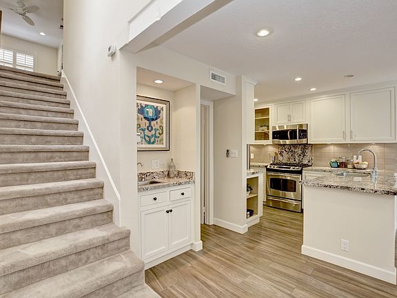 Ideally situated in coveted Newport Beach, this gorgeous townhome has been extensively remodeled and upgraded with the finest in finishes and fixtures. The well-designed floor plan features 2 bedrooms, a bonus loft/office space, and 2.5 bathrooms. The main level features an open concept layout with soaring ceilings, a spacious living room with fireplace, a charming eating area, and a remodeled kitchen that is every chef's dream. The custom white cabinetry is accented by granite countertops, glass backsplash tiles, under-cabinet/recessed lighting, a wine refrigerator, built-in microwave, gas range & counter-depth refrigerator. Upstairs are 2 spacious bedrooms, 2 fully remodeled bathrooms and an open office/study area w/custom built-ins. The master bedroom features vaulted ceilings, cedar-lined closets, and an amazing master bathroom with custom shower, marble counters, custom cabinets and more! Additional upgrades t/out include newer A/C, carpeting, wood-like tile floors on main level, closet organizers,recessed lighting, surround sound. French doors lead to an enclosed patio with brick pavers and gas hook-up for barbecuing. 2 car attached garage w/epoxy floors. No expense was spared in creating a perfect place for you to call home!