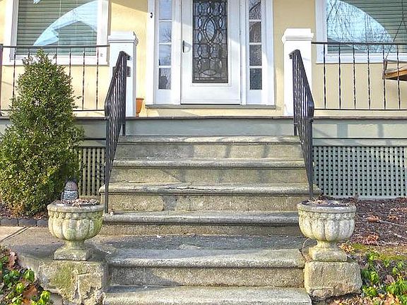 Reminiscent of Foursquare architecture displaying variations with the arched porch opening and bay windows. This home is a fabulous blend of 1920s vintage features, including original hardwood flooring throughout with today's hues & style! Enter through a leaded glass door to the living room that expands across the full width of the house, sun-drenched by 4 windows, and presents a center stage white brick fireplace. A wide passage to the dining room featuring bay window, starburst chandelier, and captivating stained & leaded glass window lites to kitchen. The kitchen has been remodeled revealing granite counters, large subway tile backsplash, white cabinetry, center island with seating plus tile flooring. Window door leads out to enclosed porch serving as a great mud room and storage of everyday items. The lower level is partially finished including a wet bar and rec room (current used as a home gym); separate laundry/mechanical room. Traditional newel post at beginning of wooden staircase to upper level hall with linen closet. The bathroom has been remodeled offering sconce lighting between mirror front medicine cabinets above double vanity of white cabinetry/drawers, glass sliding doors to shower with subway tile surround and rainshower head, plus white tile floor. Three bedrooms on the second level (2 with bay windows) and another on the 3rd level. The backyard is completed fenced with a patio area. A pedestrian door to the 2-car detached garage with access from the alley. Enjoy the large front porch with swing while overlooking the picturesque tree lined streets in this sidewalk neighborhood!