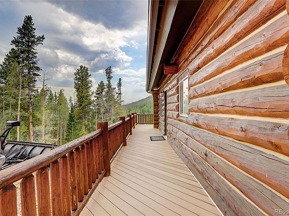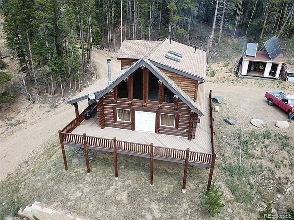 Custom Log Home on 4.96 acres with Awesome Divide Views surrounded by National Forest for privacy. In this off-grid community you can ATV/Hike/Bike/ Horse back out your front door to the many forest trails to James Peak Wilderness. Enjoy the views from the Trex deck, fire pit in yard or the great room and loft with expansive windows. Shoot guns off the deck if no fireban. Property is half on Clear Creek County side and half on the Gilpin side so it is possible to build another structure on the Gilpin side. Mine Patent #644