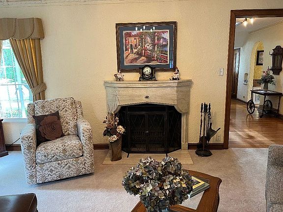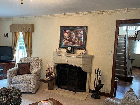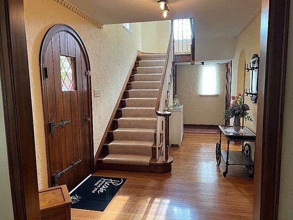 This beautiful 1927 California Spanish brick home is a one of kind. The plaster crown molding in each room is different in design. Formal Living room that has new carpet that goes out to a 4 season room. Formal Dining Room that goes out to a 13 X 9 terrace. Updated Kitchen with brick insert for the stove top . Built in oven, Refrigerator and microwave 1 yr old. Plenty of custom built solid hickory Graybill cabinets. Built in eating area. New carpet on the stairway leading up to the bedrooms. Large Master Bedroom has a office area that has it's own balcony. The 2 Bedroom are 13 X 15. Plenty of storage. Laundry in the basement with a clothes chute. Walk out basement. Beautiful landscaped yard. Garden pond with a fountain. Area to relax with a fire pit. Landscaping lights. Privacy fence. Detached 2 stall garage that the exterior matches the brick on the house.