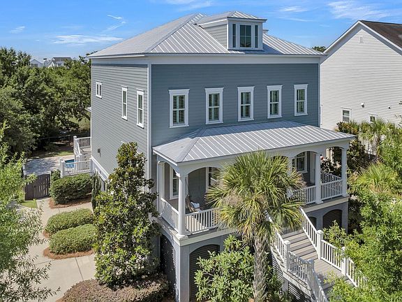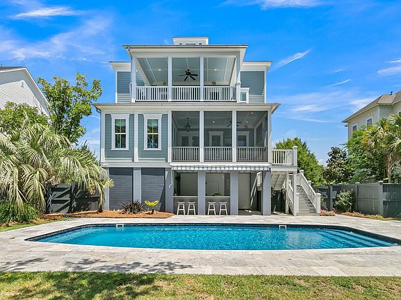Welcome home to custom design and pristine detail, welcome to an exquisite private marsh setting where two custom and expanded porches overlook a sport sized pool and entertainment oasis .... welcome home to 1551 Wando Landing Street. Nestled on a quiet street in sought after Smythe Park, this stately elevated custom home truly has it all. As you arrive you immediately note the private setting, newer painted exterior, the timeless metal roof, wood entry door and gas lanterns. Upon entry, rich hardwoods and custom trims are apparent. A large dining area and foyer lead to the open great room and kitchen. The great room features box beam coffered ceilings, a gas fireplace and French door opening to the expansive and oversized screened porch.The stunning Chefs style kitchen features gorgeous custom cabinetry, an oversized island (complete with custom love for pups:) ... a commercial style KitchenAid stove with stainless hood, pot-filler, built in fridge, and an additional wall oven and microwave. The butler's pantry / beverage center has extensive storage, a designated coffee station and wine chiller. Adjacent, a beautiful breakfast sunroom overlooks the private backyard and marsh views. A private first floor office, a spacious built-in mudroom area, and pantry / storage complete the first floor. A hardwood staircase with iron rail detail leads to the second floor. The spacious primary suite features hardwood floors and its own spacious and expanded private balcony. Enjoy morning coffee or evening cocktails overlooking the mossy oak trees and sun kissed marsh. A hallway is flanked by two walk-in closets, and leads to the primary bath featuring dual vanities, a walk-in shower and luxurious soaking tub. Also on the second floor, there are two additional and large ensuite bedrooms, each with their own private bath and walk-in closets. The laundry room is located on the second floor. A third floor features a large fourth bedroom with full bath, as well as a very large bonus room. All secondary bedrooms and bonus space have brand new carpeting. Outside, the beautiful fenced backyard oasis showcases an extremely spacious patio with travertine decking, inground pool, and fabulous outdoor entertainment bar / serving area with sink, beverage fridge, shade awning and an additional ½ bath located in the elevated 2 car garage. The large yard and gorgeous marsh views make for perfect gatherings, privacy and relaxation. Additional features also include maintenance free decking and stairs, plantation shutters, and extensive storage and closet space, no organization and storage opportunity was missed. This incredible home is just a short walk or bike ride the amazing Daniel Island schools, pool, parks and restaurants. Welcome home!