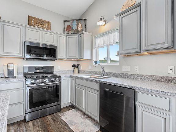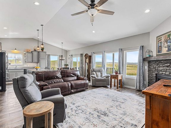 Check out this 2,746 sq. ft., 4 bed, 3.5 bath, 3 car fully finished heated garage home in Sunset Ranch on 8.26 acres with a pond. The main level has an open concept, vaulted ceiling, half bath, slate accented gas fireplace, LVT flooring, a walkout to a covered deck, 2 bedrooms; the primary has a walkout to a 10x10 deck, bathroom with dual vanity, soaker tub, tiled shower, and walk in closet. The 2nd bedroom has an ensuite shower/tub support handles. The kitchen has granite countertops, soft close drawers, stainless-steel appliances, and a large pantry. The basement boasts a spacious family room, walkout to a 40x12 patio, 2 bedrooms, and a shared bathroom. Other features include, solid core doors, main level laundry, shed, 50/30-amp connection, RV hookup, generator ready, river rock & brick landscaping, above ground sprinkler system, 9 raised flower/garden beds, a running stream at the rear of the property, and maple trees along driveway.