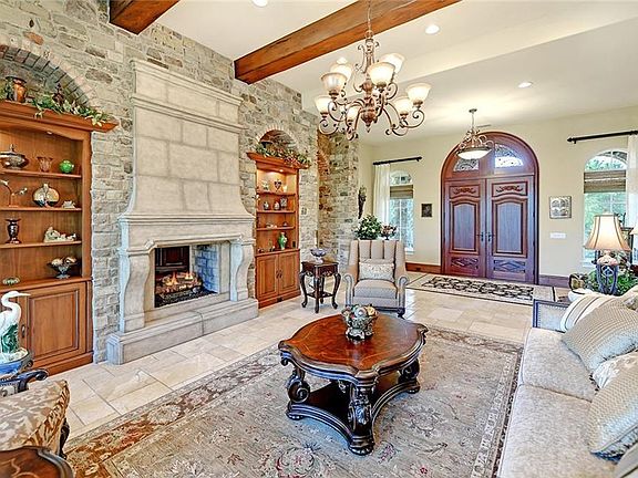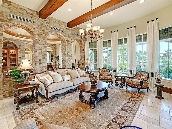 An absolute masterpiece of architectural design, this French Chateau with almost an acre of manicured gardens complemented by a spectacular lake view, offers a life defined by timeless elegance and exclusivity. This spectacular estate sets the tone for this palatial residence, where a host of opulent living spaces encase you in luxury from the moment you step in. From the incredible stone walls and brick backsplashes to the elaborate crown moldings and stone fireplaces, prepare yourself for an evening of refined entertaining. The true gourmet kitchen with granite countertops, top of the line appliances, open dining room, and separate butler's pantry with bar make this a definite yes. Unwind for the night in the regal master suite with walk in closets and luxurious master bath with his and her vanities. Step outside to the breathtaking outdoor living space where one will refresh in the heated pool with spa and entertain alfresco from the covered lanai, before capping the night by the glow of the outdoor fire pit and view of the gazebo. The inviting guest house is the ideal space with morning bar, bedroom, bath and lanai which leads one to the elaborate gardens. Other notable features include three additional guest suites, private den and additional 5th bedroom or second office, outdoor lighting, stone fireplaces, enchanting living room, and porte-cochere entry to garages, 4 AC units/ 4 zones. This gated estate not only exemplifies it but absolutely defines best in class.