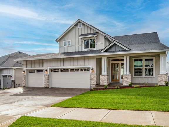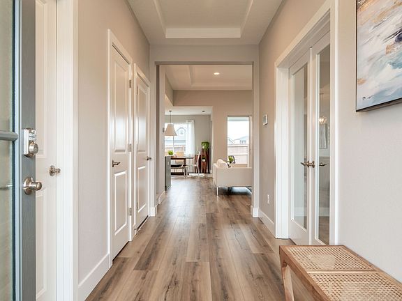 Classic architectural features and a primary on the main layout are hallmarks of the stunning Nisqually plan. At 2,272 square feet with three to four bedrooms and two and a half baths, this contemporary two-story floor home lives large and caters to today's lifestyles. Enjoy immediate curb appeal with four lovely elevations from which to choose, each distinctive and full of character. A gracious covered front porch welcomes you home and makes for a comfortable perch to connect with neighbors and watch the kids play. Architectural window awnings, along with the covered porch, increase the home's energy efficiency and keep interiors cooler in the warmer months.The Nisqually opens to a dedicated entryway with a coat closet and powder room situated apart from the first-floor living areas. Interior detailing, including coffered ceilings, creates lovely character and a welcoming sense of arrival. Purposeful design elements throughout ensure no wasted space in this beautiful and inviting floor plan. A generously sized den just off the entryway expands common living areas benefitting families continuing to spend more time at home. With access to the great room beyond, transform the space into an extended lounge space, media room, home office, or kids' study room. Garage entry is also just off the light-filled hallway, with an optional three-car garage or shop available for even more storage and workspace.