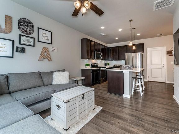 Modern Finishes Throughout! 2 bedroom, 3 bathroom Townhouse with LOW HOA - only $54 Monthly! Spacious open floor plan, desirable neutral paint palette plus main level wide plank luxury flooring! Inviting living room opens into the gourmet kitchen with island/breakfast bar, stainless appliances, Quartz counters, tile back splash, espresso colored cabinetry and eating space. Convenient upstairs laundry, secondary bedroom w/walk-in closet and en-suite full bathroom provides the opportunity for private guest or roommate suite. Relax and unwind in the Master Retreat w/ceiling fan, walk-in closet and en-suite bathroom with double vanity, Quartz counters and tile shower surround. 2 car attached garage plus ample visitor parking! Fenced front porch provides the perfect place for entertaining or casual outdoor living. Well maintained HOA with LOW $54 Monthly Dues offers maintenance free exterior and community pool and park steps from your front door. Excellent location with convenient access to area shopping, dining, biking/walking trails, open space and minutes to G-Line light rail! There's no better way to brighten your future than in this beautiful home.