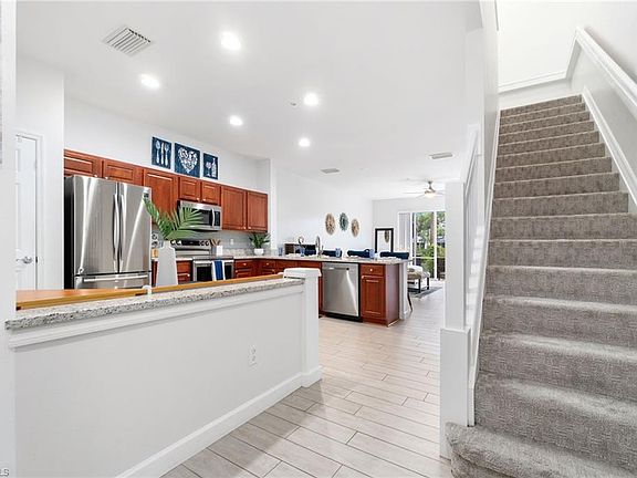 This charming 3 bedroom, 2.5 bath, lakeview townhome in North Naples offers the perfect blend of luxury and comfort. Meticulously upgraded and beautifully maintained, this home is a true gem. Step inside to discover the elegance of wood-like tile flooring that flows seamlessly through the living and wet areas, providing a chic and durable foundation for your lifestyle. The bedrooms feature high-end carpeting, adding a touch of warmth and comfort. The entire home is painted in cool tones, creating a serene and inviting atmosphere. Custom tile work in the bathrooms adds a touch of sophistication, while decorative accents like custom wallpaper details bring unique charm to the space. The kitchen is a chef's delight with granite countertops and a cozy corner eat-in breakfast table, perfect for casual dining. Enjoy your morning coffee while taking in the serene lake views. With low HOA fees that include cable and internet, this home offers exceptional value. Located just minutes from shopping, dining, and within a 10-minute drive to Naples' beautiful beaches, convenience is at your doorstep. Plus, it's situated in a top-rated school district, making it an ideal choice for families. Don't miss this opportunity to own a piece of paradise in North Naples. Schedule your showing today and experience the beauty and comfort of this remarkable townhome.