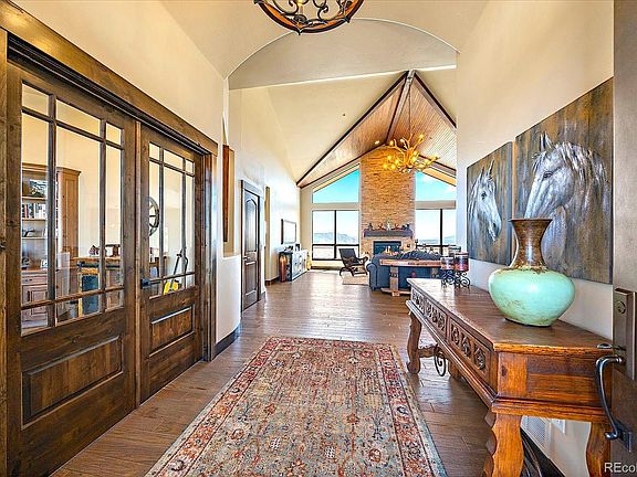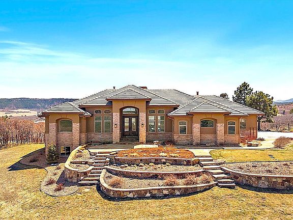 Welcome to this exquisite 5-bedroom, 5-bathroom custom ranch-style home set on 4.5 serene acres, offering breathtaking views of canyons, mesas, and Pikes Peak. This home has been rebuilt from the ground up, not just remodeled. With a thoughtful layout and high-end finishes throughout, this home delivers luxury living in a private and picturesque setting. The chef’s kitchen is a showstopper, featuring custom knotty alder cabinetry, 1.5-inch-thick granite countertops, custom lighting, a spacious eat-in area, and a walk-in butler’s pantry. The family room exudes warmth and character with vaulted ceilings accented by a linear wood inlay, a cozy fireplace, hardwood flooring, and expansive windows that flood the space with natural light and frame the stunning views. Retreat to the main-floor primary suite, complete with private deck access, scenic views, and a spa-like 5-piece bath featuring a walk-in shower, soaking tub, his-and-hers vanities with knotty alder cabinetry, granite counters, and custom tile flooring. The main level also includes a private guest ensuite, powder room, formal dining room, laundry room with cabinetry, and a dedicated office with built-in alder woodwork. The walkout basement is an entertainer’s dream—offering two guest bedrooms with a Jack-and-Jill bath, a home gym, powder room, media room, and a massive wet bar with custom cabinets and granite. A hidden sauna behind a sliding barn door adds a luxurious touch. The oversized 3-car garage is fully finished with insulation, drywall, and epoxy flooring. Outside, enjoy a fully fenced property with gated entry, a paved driveway, and direct access to trails and open space. Don't forget about the concrete tile roof for peace of mind and easing of insurance costs. This versatile lot allows for horses, a barn, ADU, or workshop—with no other homes in your view to interrupt the peace and natural beauty. Great location just south of Castle Rock but far enough to enjoy piece and quiet.