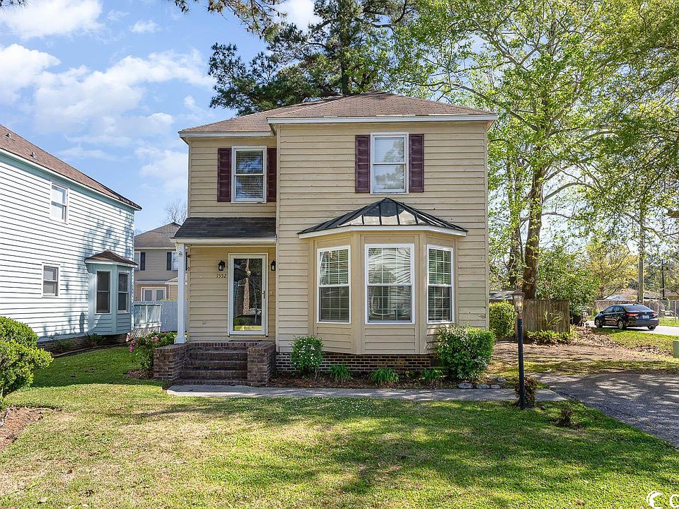 Welcome to your new home! This charming two-story single-family home in Myrtle Beach offers a spacious and comfortable living experience on a corner lot with mature trees. The main floor features, a formal dining room with bay window, perfect for entertaining friends and family. The great room is the heart of the home with built in bookcases, a cozy wood burning fireplace for chilly evenings and a sliding door that leads to a lovely back deck, where you can relax and enjoy the sunshine. The sun filled kitchen with a window over the sink has a pantry and lots of counter space, including a pass through to the breakfast nook complete with a bay window. The backyard is fenced and there is plenty of storage with a storage closet on the deck and a detached shed in the yard. Upstairs you will find all 3 bedrooms providing ample space for your family or guests, all with newly installed carpet. The primary bedroom with en-suite bathroom with a shower has two closets and is a generous size. Located in the heart of Myrtle Beach yet tucked away in a small 18 home neighborhood without the restrictions of an HOA.  This property would be perfect for a primary or vacation home or as an investment with the opportunity for short term or long term rentals. With just 2 miles to the beach, you’ll have the perfect spot for a day of sun, sand, and surf and just a short distance from some of the best restaurants, shopping centers and entertainment options. This home does need some TLC to bring it up to its full potential and is being sold 'As Is'. The seller is offering a one year home warranty.  Buyers are responsible for verification of square footage.