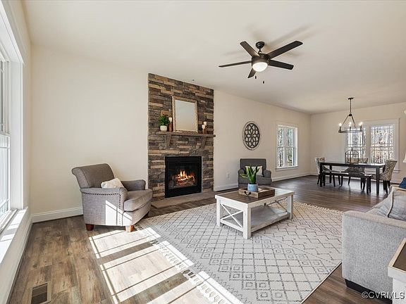 Discover your dream home with this stunning new construction, ideally located in a prime Powhatan area—that isn't located in a subdivision. Set on a spacious 2.31-acre wooded lot, Ready for a quick closing and offers an ideal blend of comfort and style. Home is 100% complete and the photos are of the actual home and land. The open floor plan includes a first-floor primary suite, along with three additional bedrooms—each with its own attached bathroom. The great room is bright and inviting, featuring a stone gas fireplace, while the dining area seamlessly flows into both the great room and kitchen. The kitchen boasts light cabinetry, granite countertops, under-cabinet lighting, and a striking 62” designer island. A freestanding double oven, 9’ ceilings, and low-maintenance LVP flooring add to the appeal.