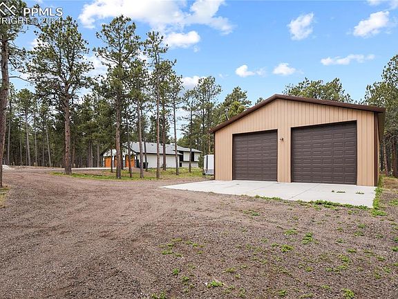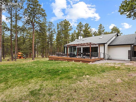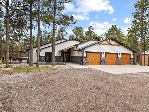 Masterfully remodeled sanctuary in the pines on 6 heavily wooded and mitigated acres in sought after Black Forest providing you the best of both worlds - living on serene, park like acreage while only a short drive to the best amenities. Detached 60x40 metal RV garage with two overhead doors, upgraded separate electric panel providing enough power for RV's and all of your tools, two enclosed workshop areas w/ heat and AC. Parking for 9+ vehicles. The well designed home lives and feels as if you were living in an architectural digest and has been completely remodeled from top to bottom. Upon entering the home you are greeted by soaring vaulted ceilings with beautiful tongue and grove wood ceilings, stone columns, new custom metal railings, wood beam accents, beautiful warm floors, bright light floods the interior from the wall of windows and multiple skylights. Open concept kitchen which is awesome for entertaining guests in the great room. The kitchen has light modern cabinetry, slab quartz counters, a large island with waterfall quartz on both sides, gas commercial range, convenient pot filler and bar w/ built in wine fridge. The great room is expansive in size but feels inviting. Wood fireplace w/ floor to ceiling stone surround, a wall of windows w/ double opening doors which truly bring the beauty of the outside in. The new composite deck overlooks the mature ponderosa pines, has a built-in pergola and hot tub. The primary suite has a fireplace, a walk-out to a private deck and a completely remodeled 5 piece master bath. The master bath has a standalone tub, stone accent wall, double vanity w/ waterfall stone, multiple shower heads and shower massagers. New upgraded roof, doors and windows. Zoned for horses and outbuilding friendly. Sought after north El Paso County location with great access to Highway 83, I-25 and a short commute to Colorado Springs or Denver. Award winning School District 38. Completely fenced acreage with two driveways and custom gates.