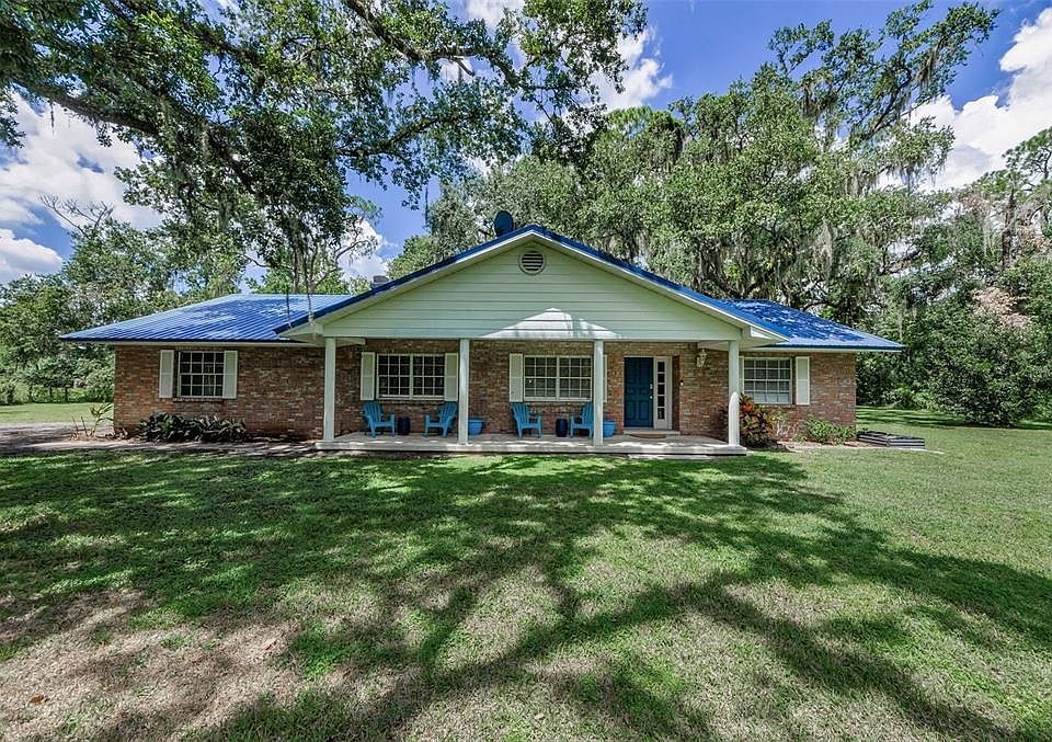 BRING THE HORSES! *NO HOA. NESTLED ON A PRIVATE- SECLUDED (3.24) ACRE FENCED LOT WITH A BARN you will find this charming and spacious 3-bedroom, 2-bath country ranch-style home. As you enter through the front door you are greeted by a wall of flagstone in the foyer. To the left is the combination living/dining room featuring a wood-burning fireplace surrounded by a flagstone wall. The kitchen is equipped with double built-in ovens, solid wood cabinets, and a large island overlooking the family room. The split floor plan offers privacy for all. There is a private hallway leading to the laundry room and the primary suite with two walk-in closets. The primary bathroom offers dual sinks and a jetted tub. On the opposite side of the home are two generously sized bedrooms flanked by a guest bathroom with double sinks and a linen closet. The home also features an oversized side-load one-car garage, rain gutters and a metal roof installed in 2015. Enjoy the outdoor living space on the covered 36'x7' front porch with your morning coffee watching the sunrise or on the 35'x12' screened rear Lanai with a wet bar and a pass-through to the kitchen, perfect for enjoying your favorite beverage while watching a beautiful sunset. No rear neighbors within 20 acres! The property includes an AMAZING 1500 SQUARE FOOT BARN WITH A CENTER ISLE, ELECTRIC, WATER, THREE HORSE STALLS, TACK ROOM, AND TRACTOR GARAGE. * Brand new well, well equipment, and water softener in 2025. This beautiful property is a must-see! NOT in a flood zone and is situated at the end of a paved dead-end road with a winding driveway and towering grandfather oaks that lead you back to the house and the barn. Ready for your personal touches! The location is ideal, just one mile south of I-4. Twenty minutes to downtown Tampa and just a few minutes' drive to Parkesdale farm market, Keel & Curley winery, restaurants, shopping, and Medard Conservation Park, which offers fishing, hiking, boat rentals, and campground. Less than one hour from all the Orlando attractions. Bring your RV, boat, horses, farm animals, and start enjoying the Florida country lifestyle!