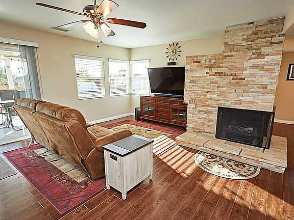 Incredible 3 bed 2 bath home. Super clean with tons of natural lighting. Brick fireplace separates dining and living room. Updated LG 5 burner/griddle top convection oven. Wood grain style tile flooring throughout, carpet in bedrooms. Large indoor laundry with gas and electric hookups and lots of storage. Master bedroom has walk in closet. Over 1/2 acre is fenced and cross-fenced, fabulous desert landscape front and back. 5 fruit trees in the back yard. Wood patio cover with lights and a fan. You will love this property!