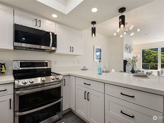Impeccably renovated w/ designer touches, a townhouse-like unit ideally situated in the vibrant heart of Burien. Meticulously crafted offering a luxurious living experience, turnkey to embrace a refined lifestyle. Walking distance to dining, shopping, entertainment, library, mass transit, Seahurst Beach. Impressive kitchen w/ gleaming quarts CT, SS appliances, pristine open-concept bright & airy living room, wood-burning FP overlooking beautiful landscaping, LVP flooring. 2nd floor features 2 full baths, plush new carpets w/spacious 2 Bedrooms w/ large closets. Small, 14 units, quaint & tranquil complex, well-managed, secure building, 1 assigned secured prkg in garage, elevator. Enhanced privacy w/No neighbors up or below. HOA covers w.s.g.