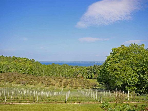 Greet each morning with the sun rising over East Grand Traverse Bay. This spacious home on 5.6 acres with expansive views is planted with wine grapes and tart cherries. Enjoy expansive views from the heated pool, deck and patio. The walkout lower level has a guest apartment plus family room. Additional 5 acre parcel may be available. Dual furnaces, irrigation, garden shed, home warranty and much more. Classic Old Mission Peninsula hobby farm property!