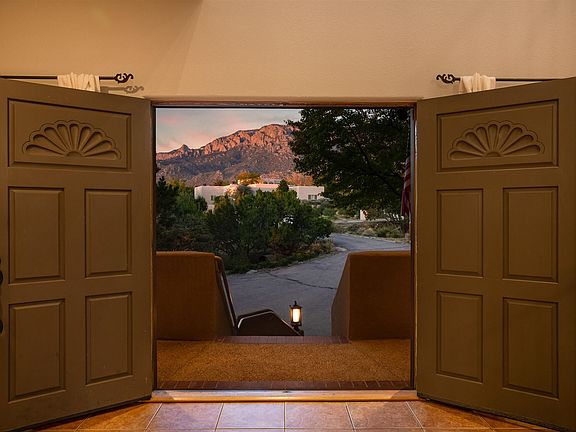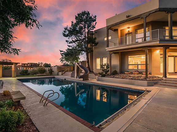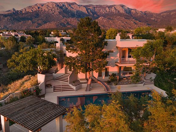 Amazing custom home in sought after Sandia Heights. Stunning Sandia Mountain and city light views from almost every window! So close to hiking & biking trails of Elena Gallegos Open Space too! Fantastic floor plan offers 4-5 bedrooms, 5 baths, office, dining, gym and best off all a beautiful large kitchen with alder cabinets, granite, Sub zero fridge and a nook with a view to die for! Spacious bedrooms with walk in closets and unique en-suite baths. Multiple living areas, viga beam ceiling, unique dual kiva fireplace. Several view decks and patios draw you out to the massive 50 x 20 foot pool featuring a gazebo and picnic area. Serenity abounds on this quiet wooded homesite which invites the local deer! Nothing like it on the market in Sandia Heights! Hurry to view!