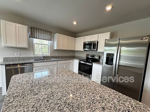 - Kitchen features granite countertops, white cabinets, stainless steel appliances, pantry, and breakfast bar