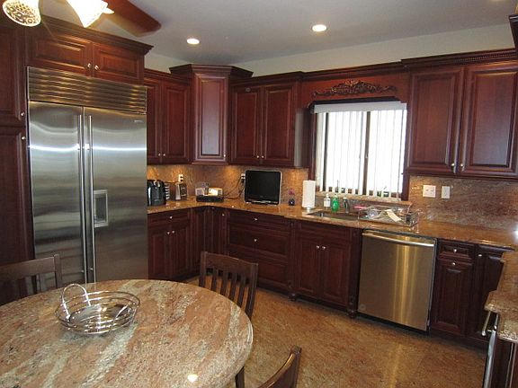 Beautifully Renovated Detached 1 family with 2 car garage & private driveway for 5 cars, cherry wood cabinets, all mahogany doors, granite counters, sub zero freezer, wolfe stove, Jacuzzi bath, granite tiles,all bedrooms have pergo floors,Finished Basement with high ceilings and 3/4 bath. Granite deck surrounds your half above ground pool and patio with a retractable awning, Must see!